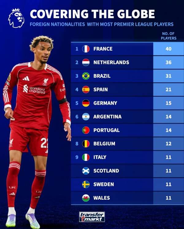 德国《转会市场》最新数据显示,本赛季英超联赛的外援版图呈现鲜明的地域特征。法国球员以40人的规模高居榜首,成为英格兰顶级联赛中最大的海外球员群体。